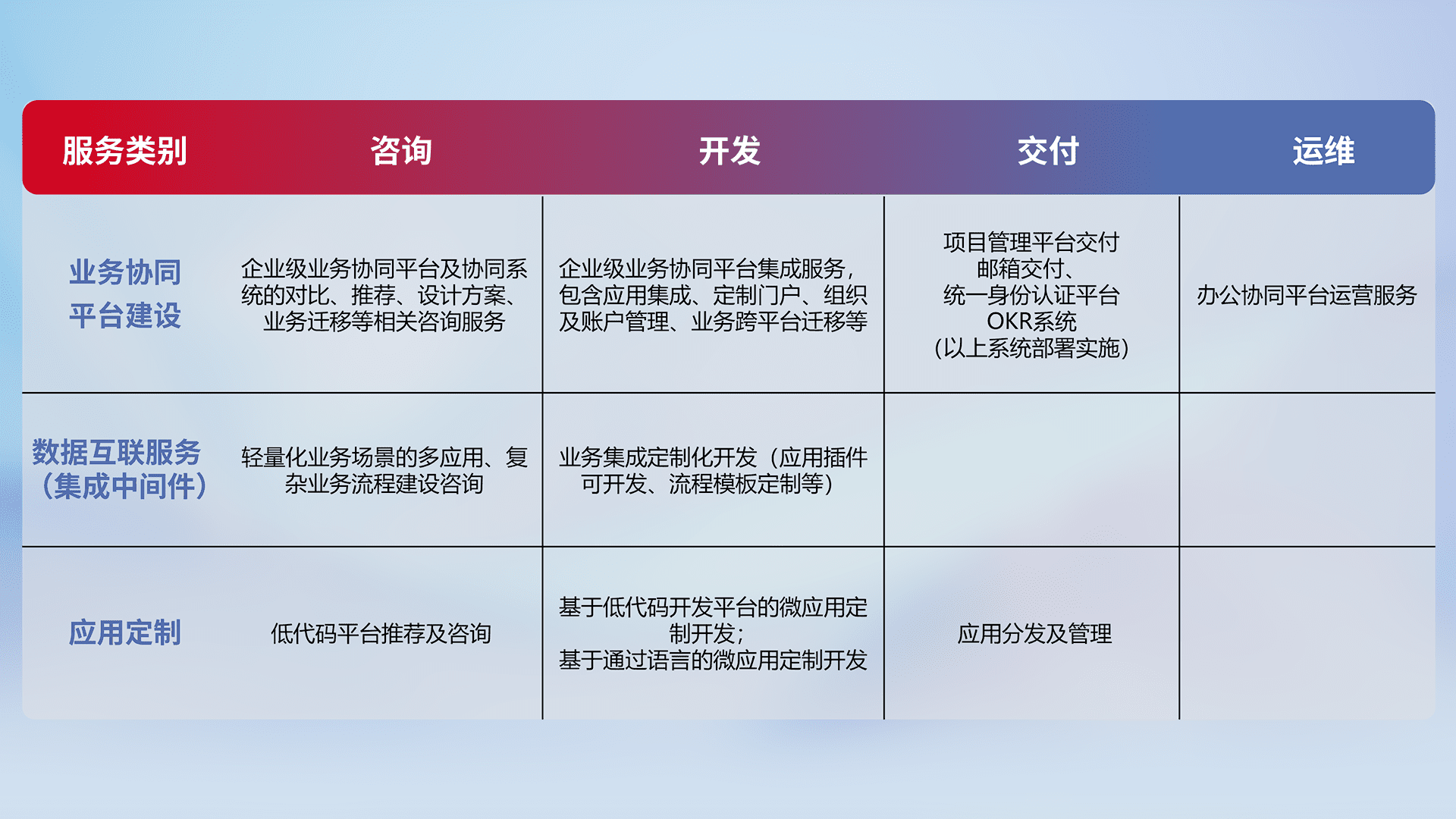 针对钉钉、、企微、、、、IDaas等平台级产品提供产品的规划、、、方案、、、交付、、、、定制化开发等服务,,,实现如统一协同办公、、智能客户服务、、混合会议管理、、、智能数据查询、、、等业务场景,,实现数字化转型。。。。